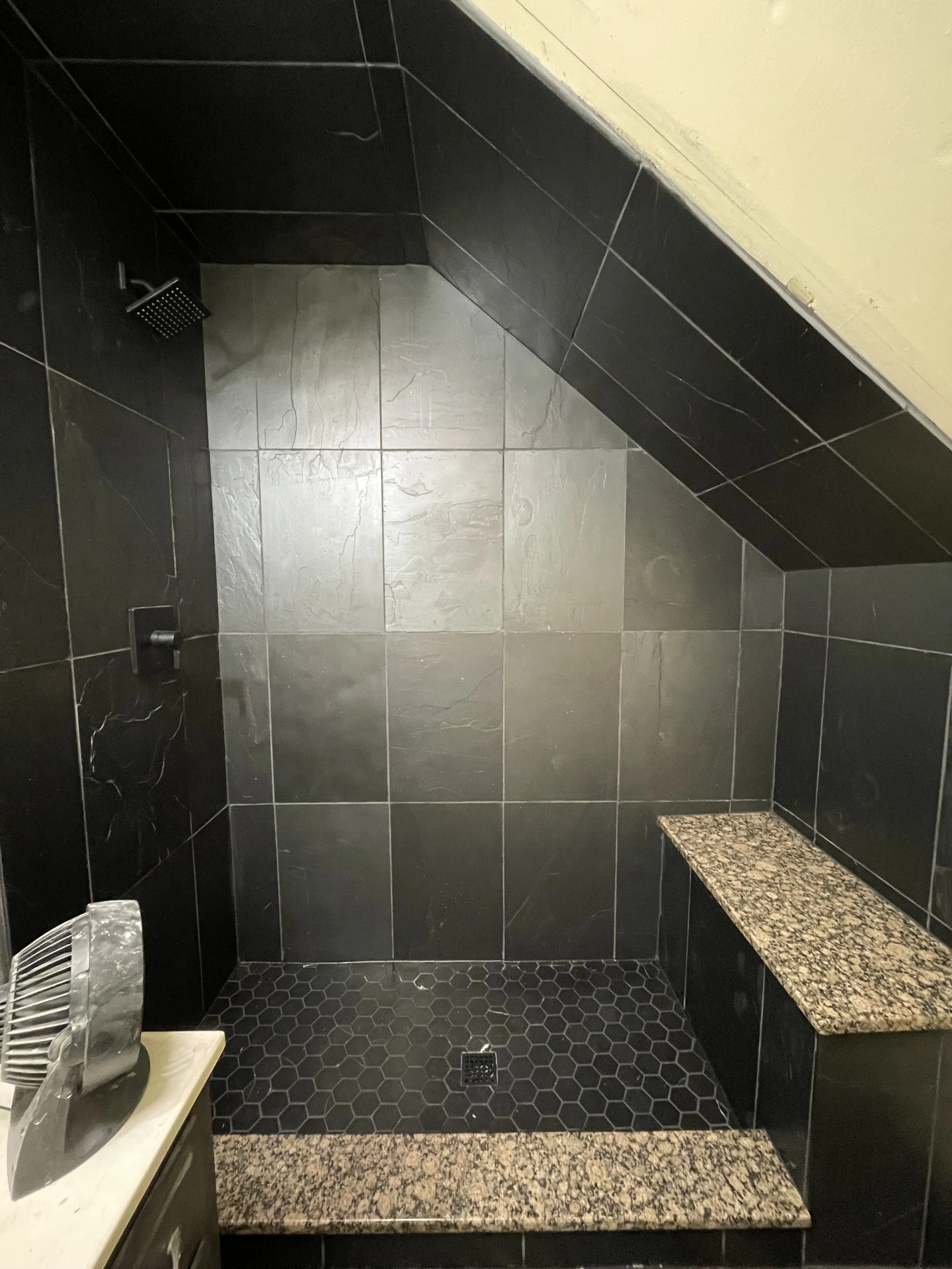 We offer natural stone vanities, countertops, shower curbs, shower bench tops, ect. We do luxury custom showers if you can invision it we can do it! We also tile floors, kitchen backsplashes, ect.